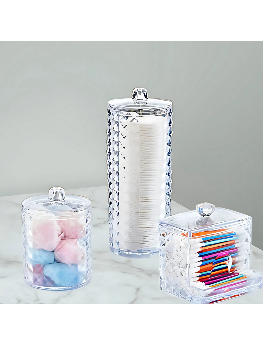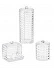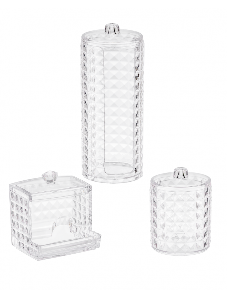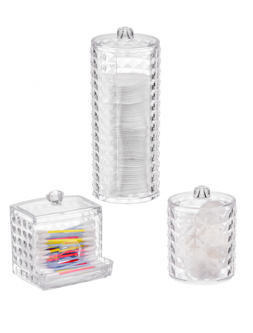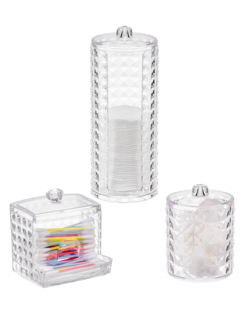 Diamond 3 lü Organizer Set Disk pamukluk, pamuklu çubuk ve makyaj pamukluğu içerir.Banyonuzdaki bütün pamuk gruplarını kullanışlı bir şekilde saklamanın en şık yolu.küçük silindir ölçüleri boy 8,5 çap 3,5 cm dir büyük silindir boy 17 cm çap 3,5 cm’dir .kulak çubuğu kutusu yükseklik 6,5 boy 8,5 cm derinlik 6,5 cm dir.